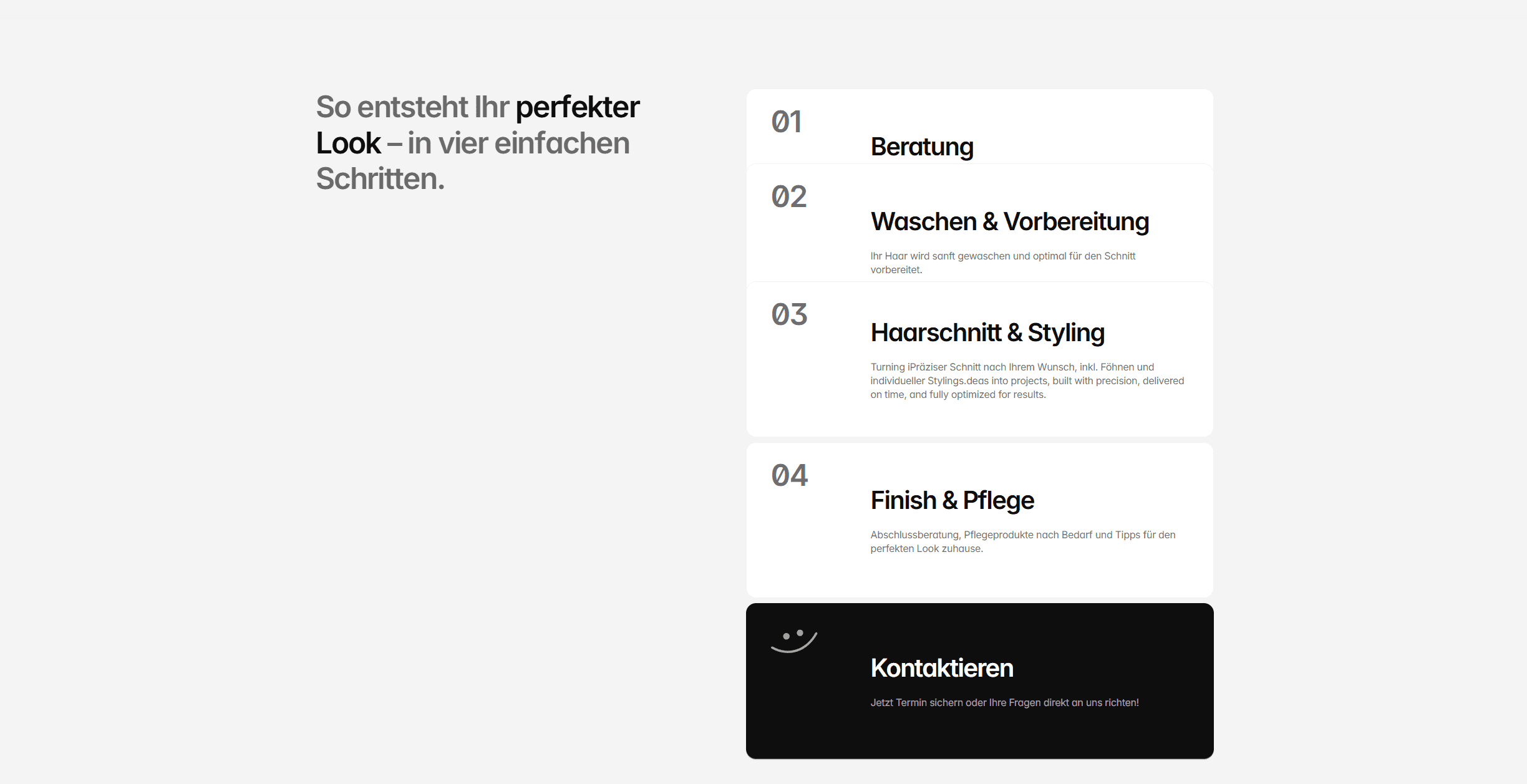 Die Herausforderung bestand darin, ein Design zu entwickeln, das modern, stilvoll und vielseitig einsetzbar ist – von Printmaterialien über Salonbeschriftungen bis hin zur digitalen Präsenz. Gleichzeitig sollte die Webseite nutzerfreundlich sein, klare Informationen zu Leistungen bieten und eine einfache Kontaktaufnahme ermöglichen.